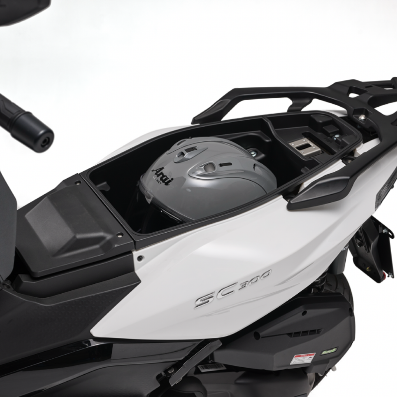 El SC300 viene con un espacioso compartimento de almacenamiento debajo del asiento, perfecto para mantener tu casco y otros artículos esenciales seguros. Esta práctica función garantiza que dispongas de todo el espacio que necesitas para tus desplazamientos diarios.